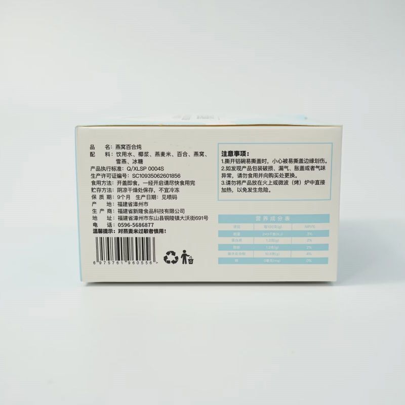 Ingrediënt: Drinkwater, kokosmelk, havermout, lelie, vogelnest, sneeuwzwaluw, rotssuiker