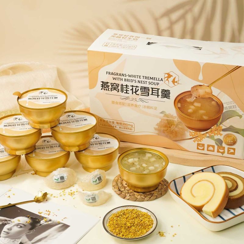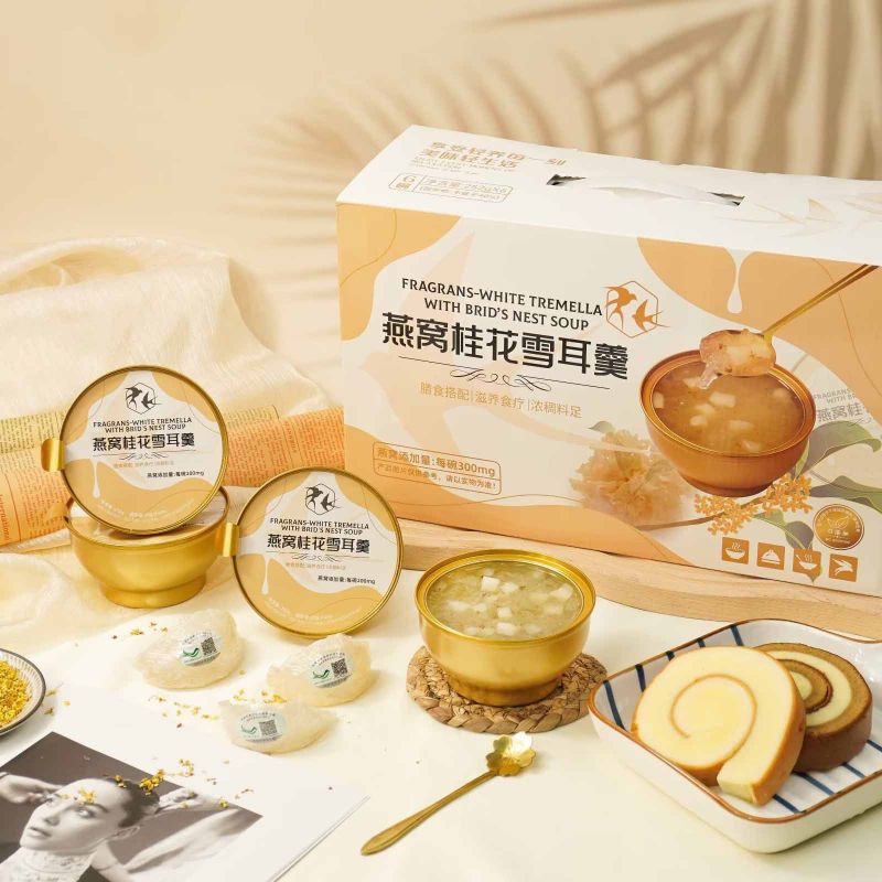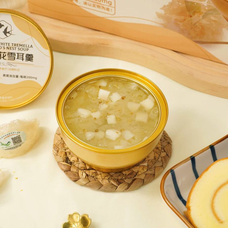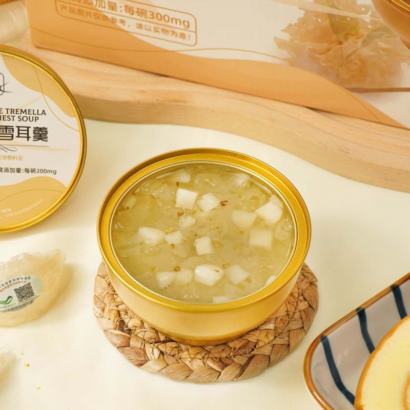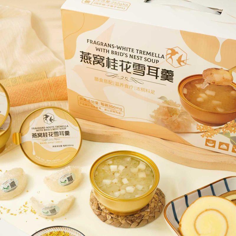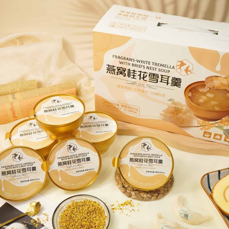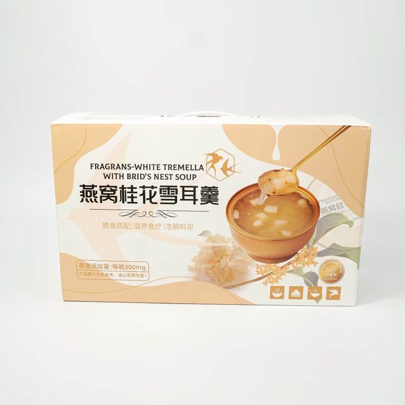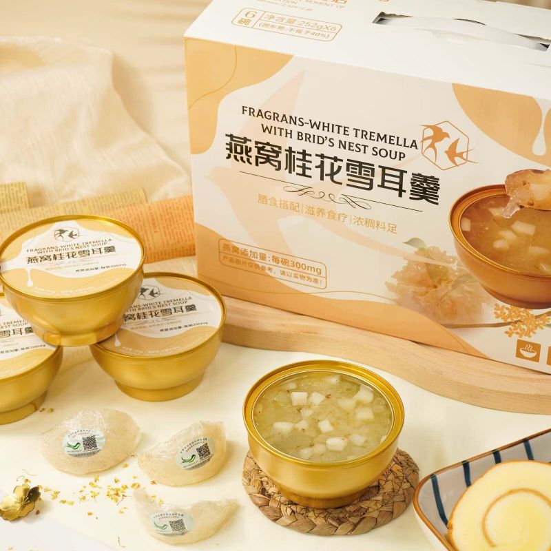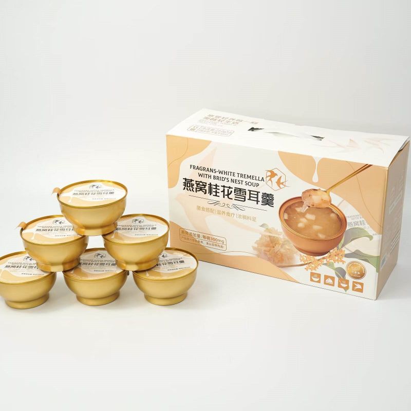 Fragrans Witte Tremella met Vogelnestsoep combineert op vakkundige wijze hoogwaardige witte Tremella en kostbaar vogelnest. Tegelijkertijd voegt het op basis van de klassieker op slimme wijze osmanthus toe, een uniek aroma-ingrediënt, om de soep een rijkere laag en textuur te geven. Unieke smaak.
